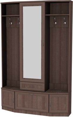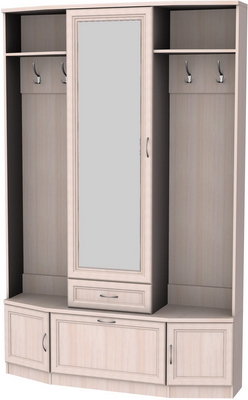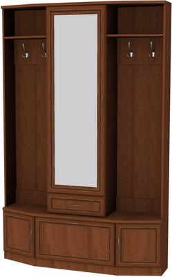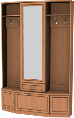 Для шкафа в прихожей очень важно наличие целого ряда функций. Особенно это важно, когда прихожая небольших размеров. В шкаф должно умещаться как можно больше вещей, обуви и различных аксессуаров. Мы предлагаем Вашему вниманию отличный вариант шкафа для прихожей, компактный и вместительный. В нем можно хранить достаточно много предметов одежды, обувь, необходимые для ухода за ними приспособления. Эта модель оборудована шестью большими секторами и выдвижным ящиком. Два сектора отведены под вешалки для верхней одежды. Среднее отделение закрыто дверью с большим зеркалом, что, несомненно, очень удобно и привлекательно. В нижних отделениях отлично расположится обувь и мелкие предметы. Все, что нужно спрятать, с легкостью уместится в выдвижном ящике и за закрытыми дверцами секций.