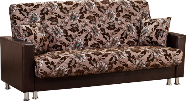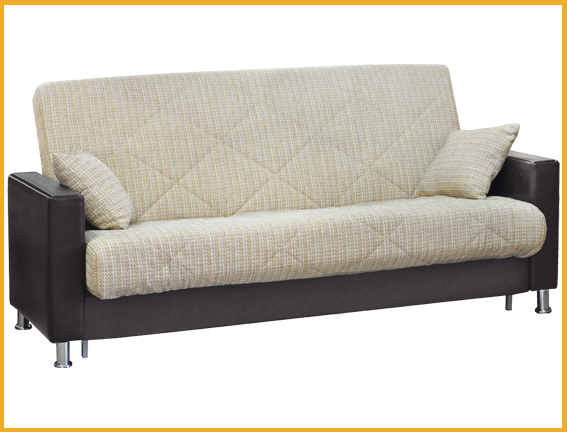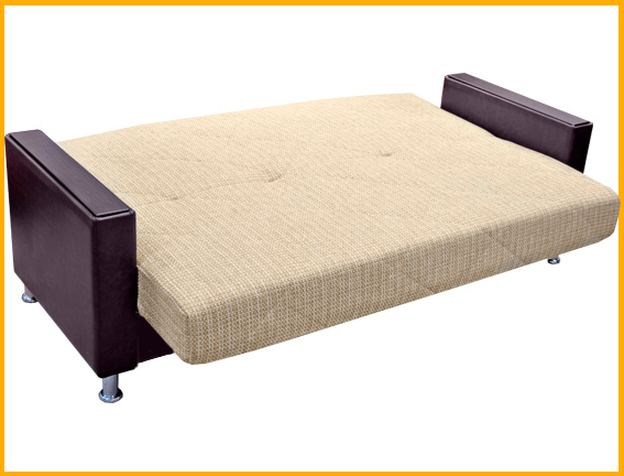 Современный строгий стиль. Съемный чехол на спальном месте. Декоративные ламинированные прямолинейные накладки на подлокотниках. Сиденье и спинка сформированы на основе металлокаркаса с деревянными латами, на котором закреплен мягкий мат, внутри которого располагается пружинный блок с настилом из термовойлока и листового пенополиуретана и соединены между собой трехпозиционным узлом трансформации. В коробчатом основании расположена емкость для хранения спальных принадлежностей. Комплектуется декоративными подушками. Для трансформации требуется расстояния между стеной и диваном. Механизм раскладки "клик- кляк".