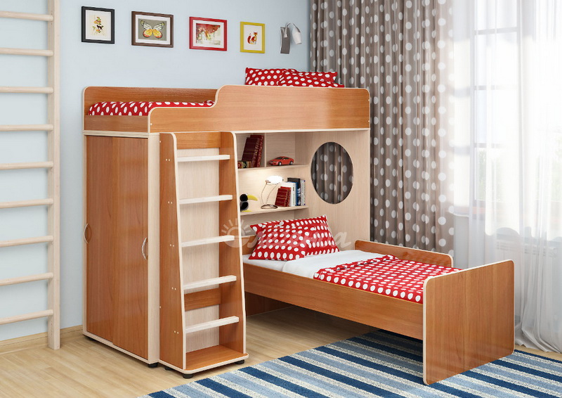 Под верхним спальным местом в игровой зоне располагается стеллаж,отлично подходящий для хранения игрушек.Стеллаж состоит из трех полок, разделенных на две секции – удобно для поддержания порядка и сортировки предметов.