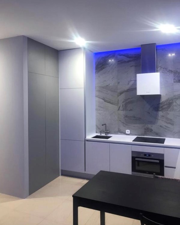 Кухня для одного человека, поэтому шкафы использованы по минимуму.