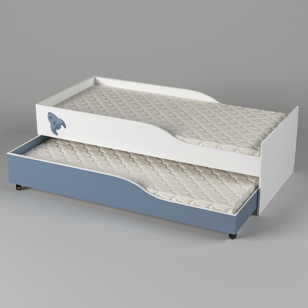 Унивесальная функциональная кровать на два спальных места, простой и надежный механизм выкатывания дополнительного спального места, нижнее основание на колесиках, которое можно выкатить и поставить в другое место. Выкатное основание так же можно использовать как зону для хранения пастельного белья. В Комплект входят декоративные накладки по тематике.