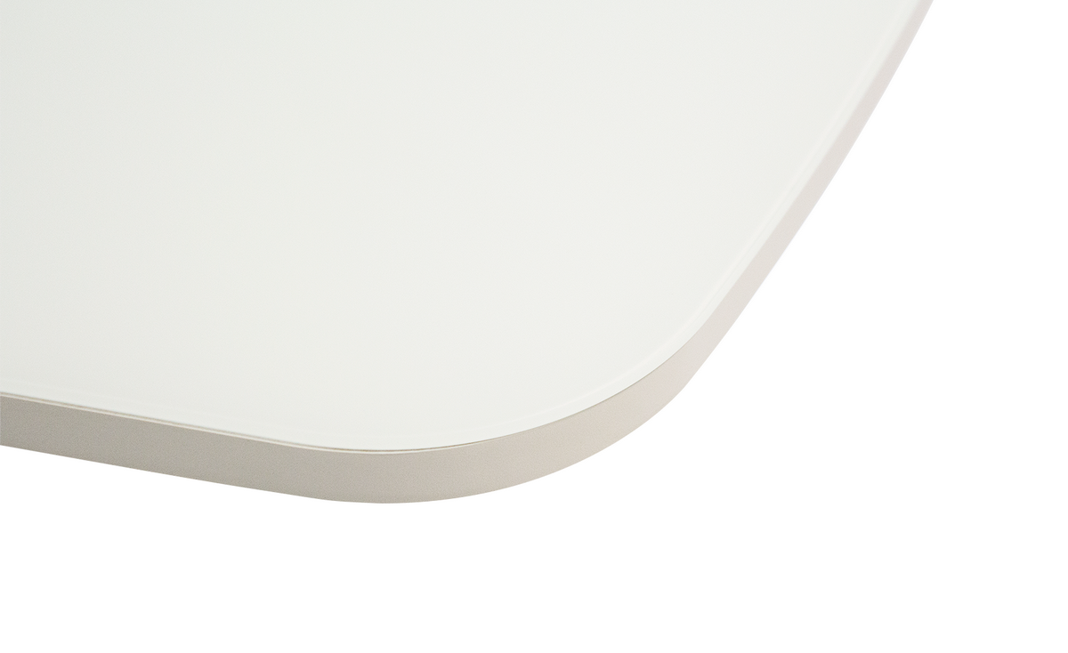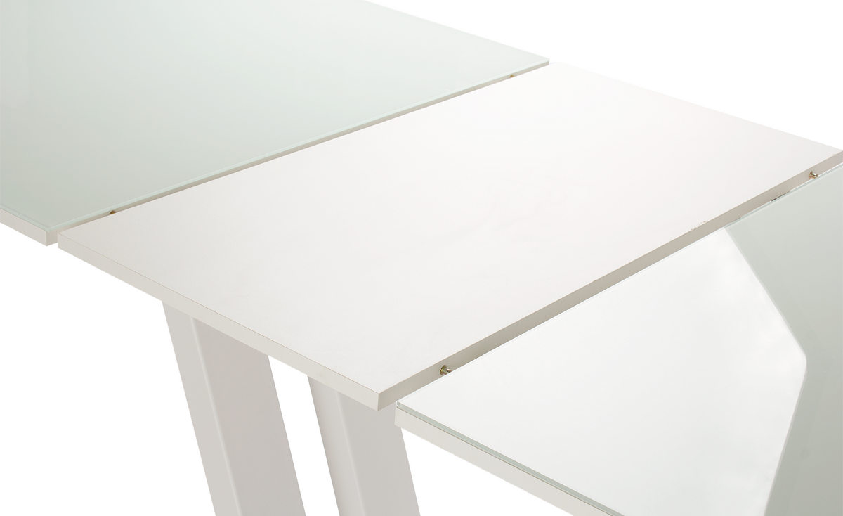 Ширина стола в собранном виде — 1400 мм. Ширина стола в разобранном виде — 1850 мм. Столешница выполнена из ЛДСП и закаленного ударопрочного стекла. Опоры и царга металлические, все крепления выполнены по типу «металл-металл», что делает конструкцию монолитной.